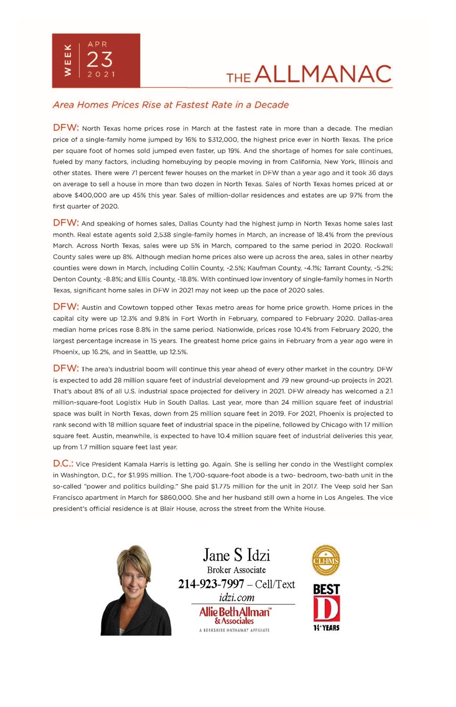Associate Broker, Allie Beth Allman & Associates, specializing in beautiful residential homes in the communities of the Park Cities (Highland Park and University Park) and Lake Forest, a gated community south of LBJ/635