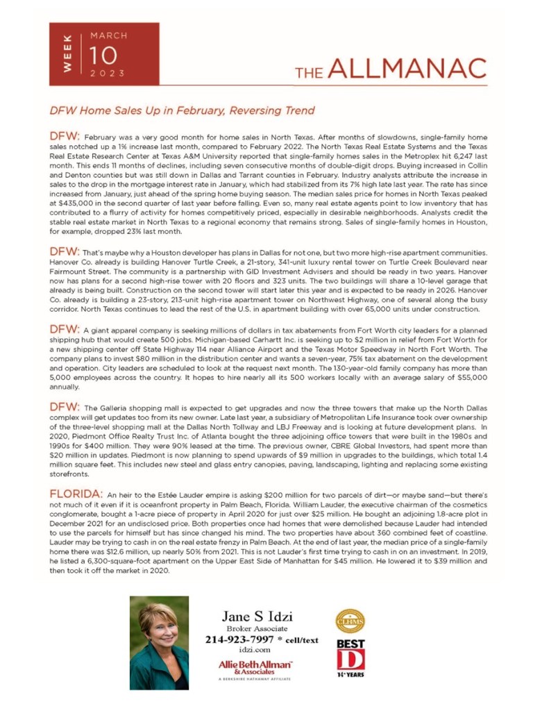 Associate Broker, Allie Beth Allman & Associates, specializing in beautiful residential homes in the communities of the Park Cities (Highland Park and University Park) and Lake Forest, a gated community south of LBJ/635