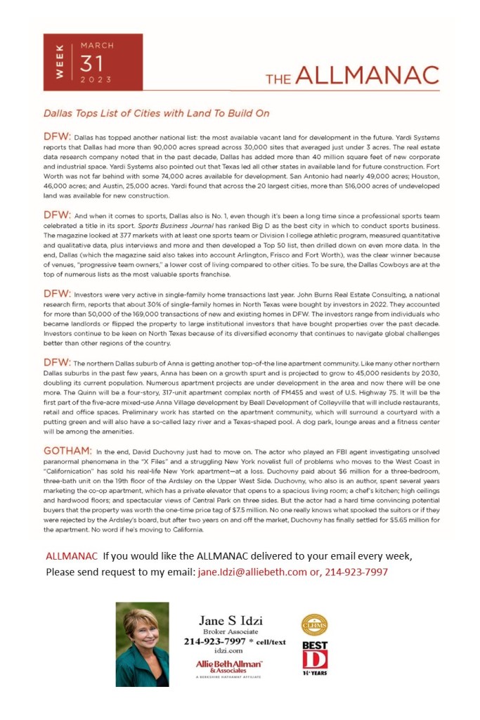 Associate Broker, Allie Beth Allman & Associates, specializing in beautiful residential homes in the communities of the Park Cities (Highland Park and University Park) and Lake Forest, a gated community south of LBJ/635