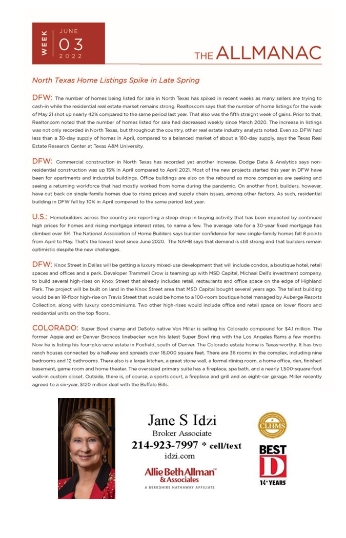 - The highest sale in DFW year to date was represented by Allie Beth Allman & Associates on both sides.